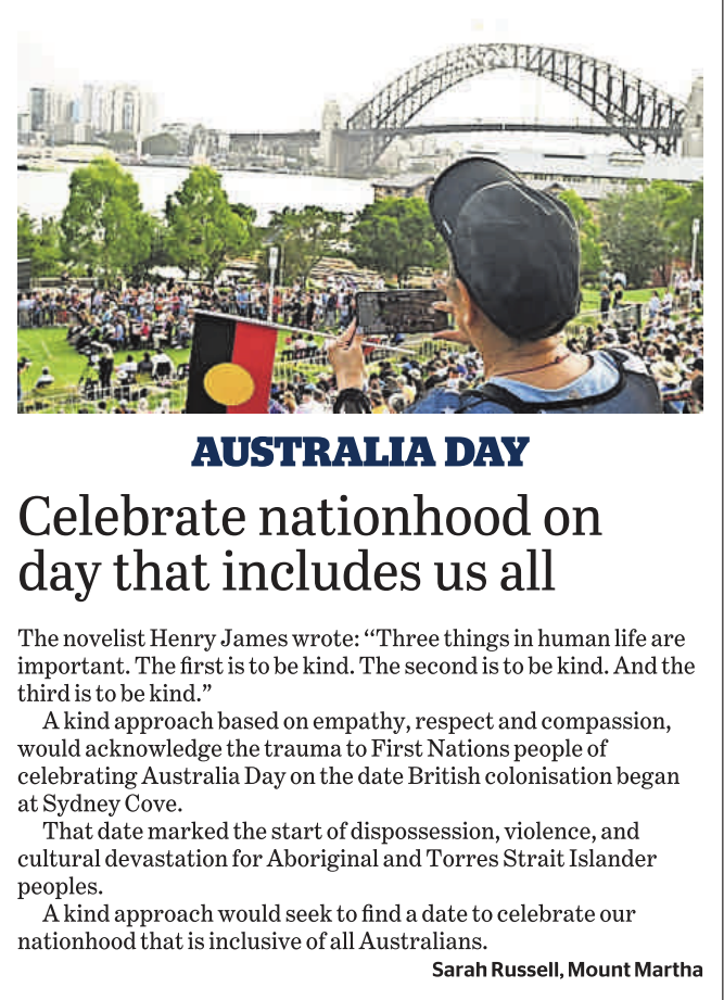 A kind approach based on empathy, respect and compassion, would acknowledge the trauma to First Nations people of celebrating Australia Day on the date British colonisation began at Sydney Cove.